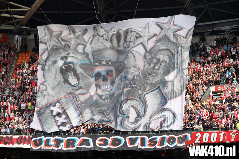 Op 410 stond vandaag een wereld primeur op het menu: ULTRA 3D VISION. Voordat het doek werd gehesen werden op het vak honderden zwarte zonnebrillen ingeruild voor 3d brilletjes. De wereld waarin wij leven is nou eenmaal driedimensionaal. Op het doek kwamen de leeuw, Ajax en 410 tot leven. Nee, ze kwamen eruit.