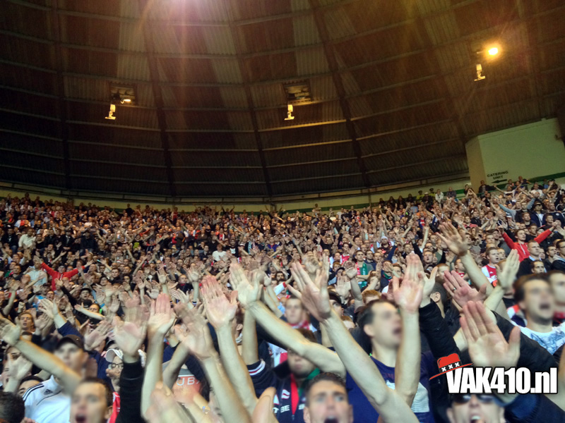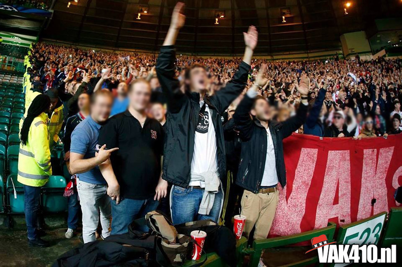 Voor de bekende Champions League hymne klonk het You'll Never Walk Alone. Werkelijk iedereen hield een sjaaltje omhoog en zong mee. Tijdens de wedstrijd was er ook een massale pogo te zien, dit was bijna te gek om waar te zijn, het hele stadion draaide de rug richting het veld. Dit was overigens als reactie op het uitvak wat knalde, vele malen werd het thuispubliek overstemd, zeker de gehele eerste helft. Vlak voor rust viel de 1-0 uit een penalty en werden de Schotse provocaties beantwoord met een regen van stoelen, munten en aanstekers. Waar de 1-1 had moeten vallen, viel na de rust de 2-0 en dan weet je dat het een heel lastig verhaal wordt. Desondanks kende het uitvak ook bij de achterstand een aantal goede piekmomenten. In de blessuretijd viel de aansluitingstreffer nog, maar dat mocht niet meer baten. Wel goed om van de Schotten zelf te horen dat er nog nooit zo'n hard uitvak is geweest op Celtic Park, een compliment om trots op te zijn. Amsterdam on top!