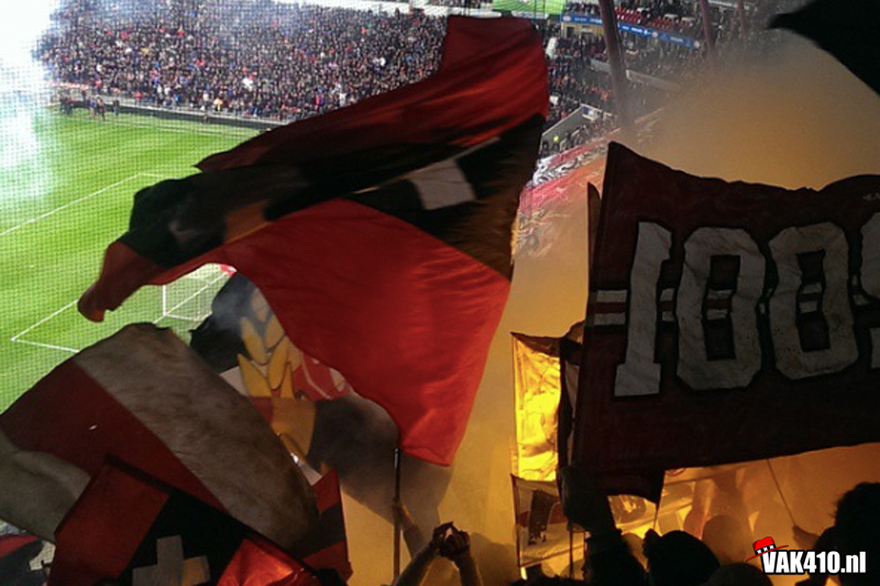 Een grote groep van VAK410 neemt vandaag wel plaats in het uitvak. Nadat diverse liederen zijn gezongen tijdens de warming up maken we ons klaar voor het begin van de wedstrijd. Bij opkomst van de spelers pakken we uit met een hoop bandieri's en vlaggen. De chaos wordt compleet met het nodige vuurwerk. Legalize pyro !