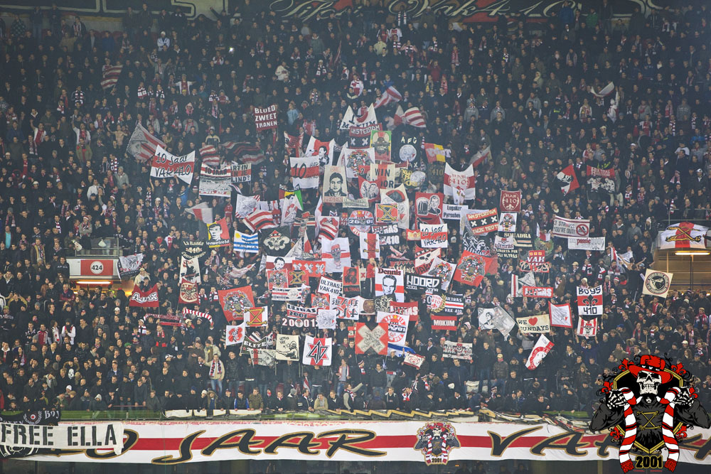 Nog voor opkomst van de spelers werd de eerste TIFO actie gehouden. Letterlijk de eerste TIFO. Net als op 25 november 2001 gingen 7 bandieri’s de lucht in met de letters AFC AJAX. Hier is het allemaal mee begonnen.