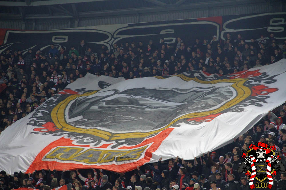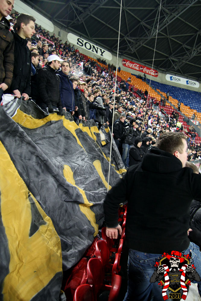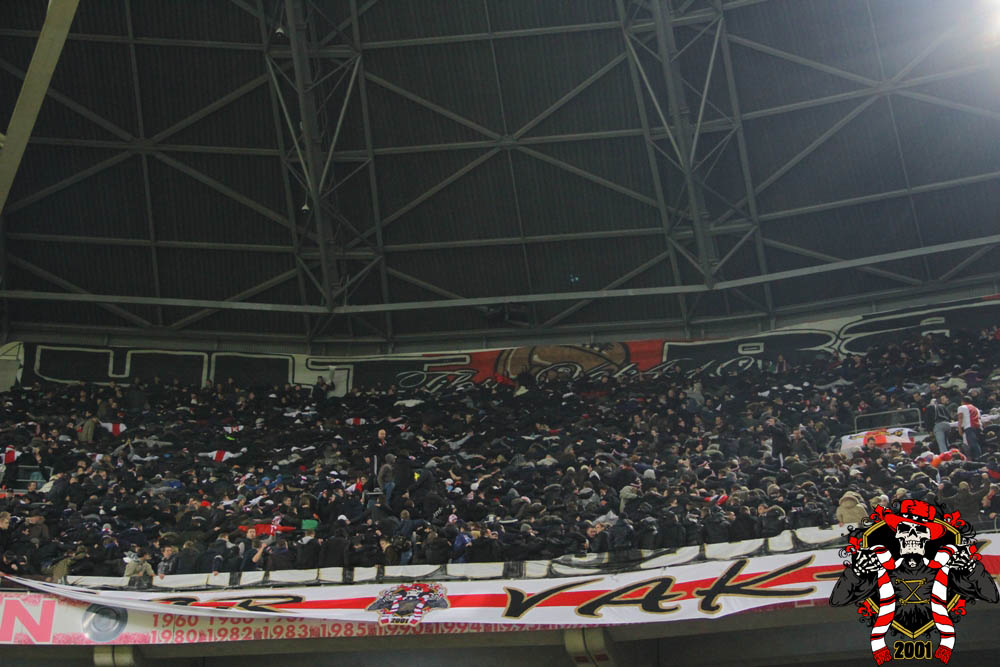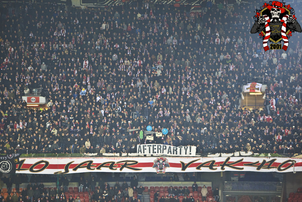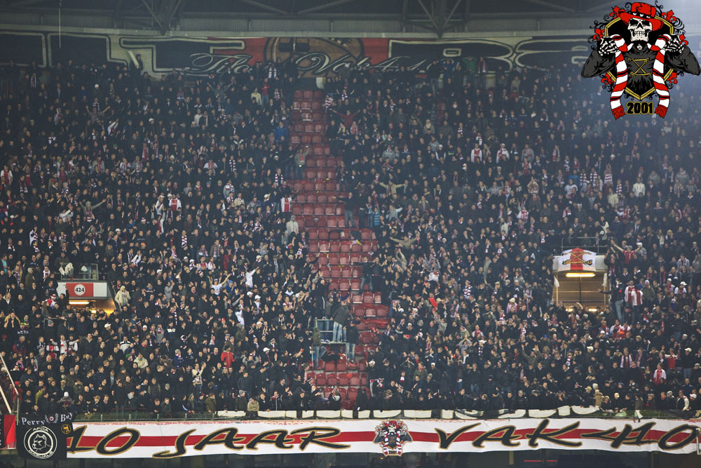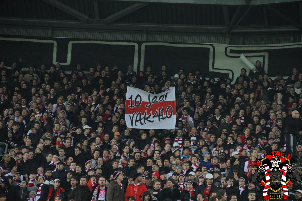 Na de corteo was het VAK als snel gevuld. Iedereen zocht zijn eigen vaste stek op of ging bij zijn oude gappies staan. Een stoel delen met z’n drieën was dan ook geen uitzondering. Wanneer de spelers het veld betraden voor de warming up klapte er een speciale ‘wit-rood-wit’ house versie uit de speakers. Het vak ontplofte die avond voor de eerste keer. Stekelenburg hing zijn 410-sjaal in de goal en de selectie toonde hun VAK410 10 JAAR shirt trots voor het vak.