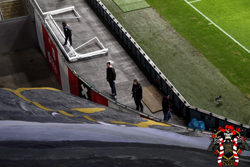 Nadat het betere spuitwerk gedaan is, verschuift de hele voorbereiding naar het stadion. De doeken opgehangen, getest en op hun plek gelegd. Tientallen draden werden van de tweede ring naar het veld gespannen. 1.600 zakjes werden gevuld met een choreovel, megaballon, handschoenen en een nieuwsbrief om vervolgens op de tribune te plakken. De TIFO groep is er na honderden uren werk klaar voor.