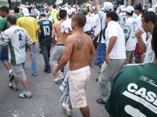 Ik kan je zeggen dat ik veel heb gezien aangaande voetbal supporters/ultras/hools enz, maar wat een ongeloofelijk massa mensen, een uitvak gevuld met 7000 trotse groene die deze kraker bezochten. De grootste torcida Mancha Verde dik in de meerderheid, na TUP Torcida Uniformizade Palmeiranse en Porks. Ik heb nog nooit zoveel groepsmerchandise en tattoos bij elkaar heb gezien,iedereen maar dan ook iedereen droeg voornamelijk Mancha Verde kleding en bijna bij wie dan ook is een of meerder lichaamsdelen besierd met in groen getinte afbeeldingen van de oh-zo-geaddoreerde groene vlek! Tijdens mijn korte bezoekje aan de shop stroomde een aantal gasten naar binnen met bebloede gezichten , ze waren aangevallen door hun grootste vijand de Gavioes da Fiel!