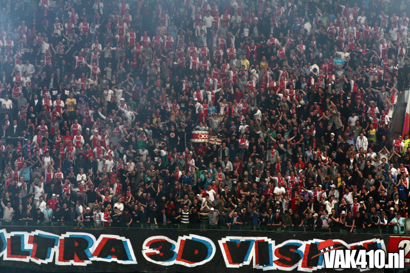 Op 410 stond vandaag een wereld primeur op het menu: ULTRA 3D VISION. Voordat het doek werd gehesen werden op het vak honderden zwarte zonnebrillen ingeruild voor 3d brilletjes. De wereld waarin wij leven is nou eenmaal driedimensionaal. Op het doek kwamen de leeuw, Ajax en 410 tot leven. Nee, ze kwamen eruit.