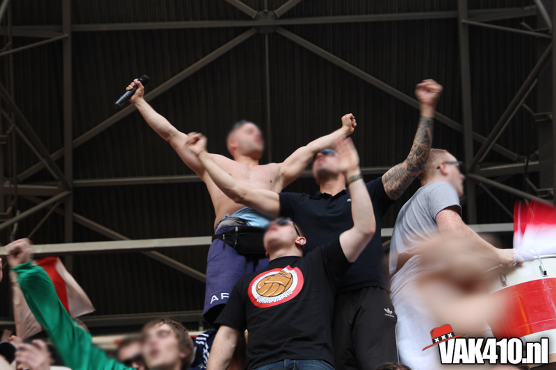 De magie van het doek werd overgebracht naar het veld en de Amsterdamse Zuid tribune. De Mokumse leeuw kwam in een ieder naar boven. De tribunes klokte, het stadion was 1. Er kon op de tribune en het veld dan ook niet meer verloren worden.